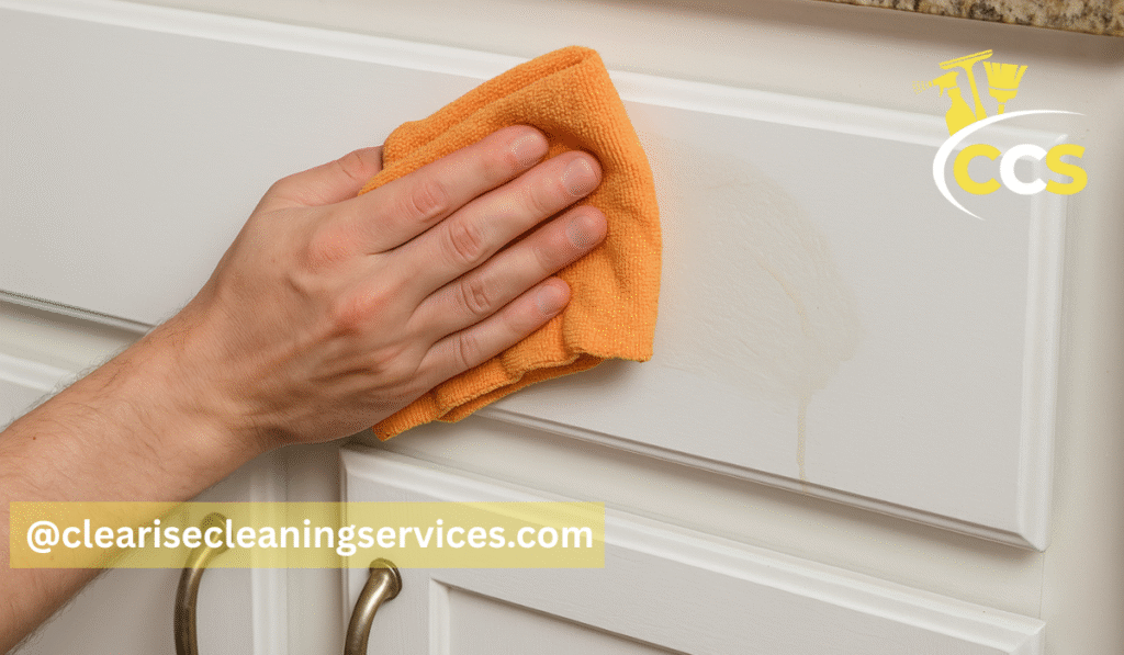 White cabinets tend to highlight even small amounts of residue. If you didn’t use a proper degreaser, or if soap or vinegar wasn’t rinsed fully, you may still feel tackiness. Sensitive finishes can also react to certain cleaners, leaving behind a film.